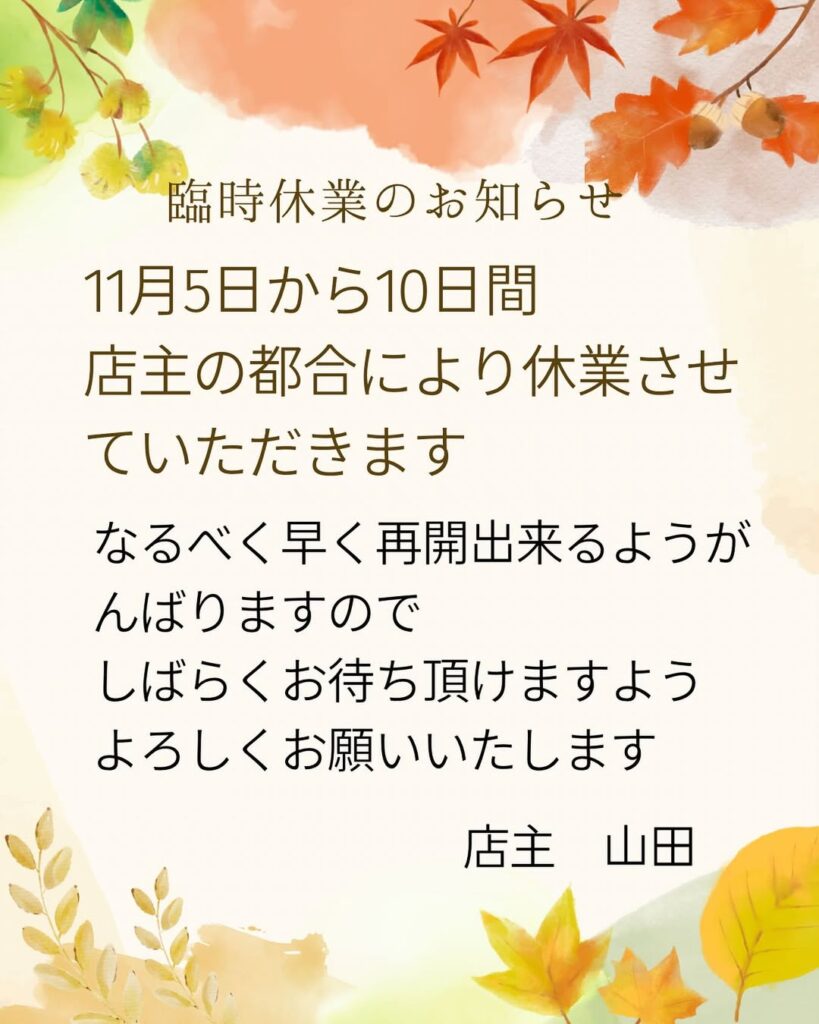 誠に恐縮ではございますが、店主の入院に伴い、【 11月5日より約10日間休業 】いたします。